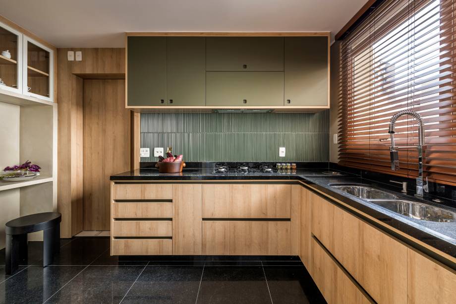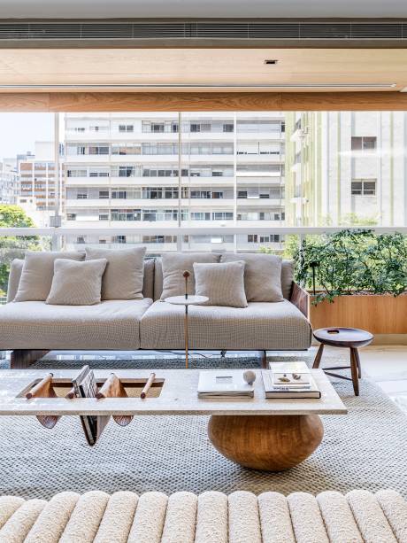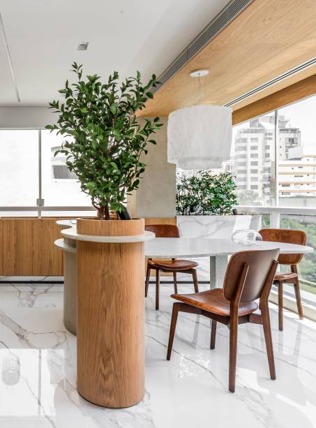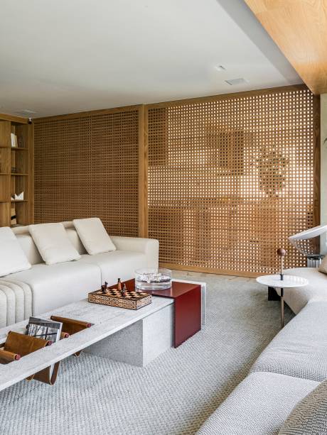 Com função também escultórica, a porta de correr em muxarabi separa a varanda gourmet da sala e foi projetada para refeições rápidas, fazer churrascos e assistir a jogos de futebol em família. A ilha, de onde também sai a mesa com formato orgânico, é o destaque do ambiente.