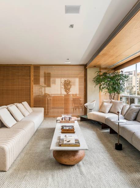 Os clientes desejavam um lar com design e conforto para receber seus filhos e netos, mesclando características clássicas, do agrado do casal, a traços contemporâneos. “No da área social usamos porcelanato italiano polido marmorizado, a pedido dos clientes, e paredes brancas para que os elementos naturais prevalecessem na composição, como a lâmina de carvalho na marcenaria, o couro, a textura mineral em tom palha e o mármore verde Guatemala, no painel da TV”, descreve Laura.