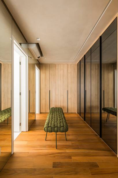 Na área íntima foi adotado o assoalho de cumaru, trazendo mais aconchego para os quartos. Na suíte master, a ideia foi dispor de um espaço confortável e preparado para a permanência do casal na capital paulista, com um grande closet, banheiros separados e uma penteadeira para a cliente.