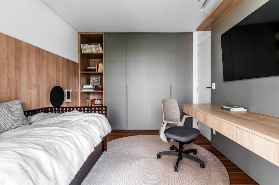 Já a área de hóspedes passou a dispor de uma suíte com cama queen, um quarto com duas camas de solteiro para os netos e um quarto híbrido com escritório, visto que os proprietários necessitavam de um pequeno espaço de trabalho em seus dias na cidade. Em todos os dormitórios, os armários foram desenhados pelos arquitetos com espaços definidos para que a bagagem não atrapalhasse a circulação. “Tudo pensado para receber bem”, conclui a dupla.
