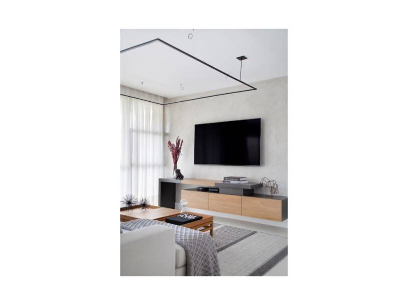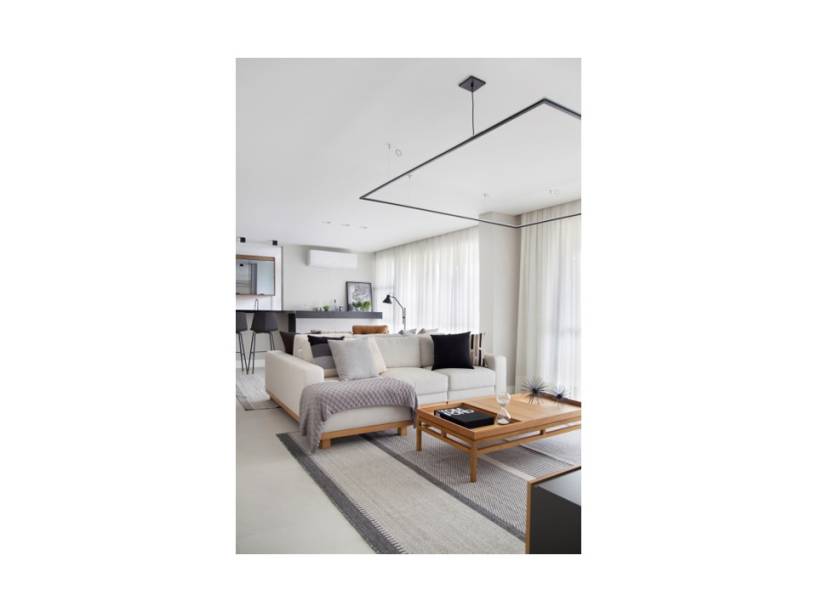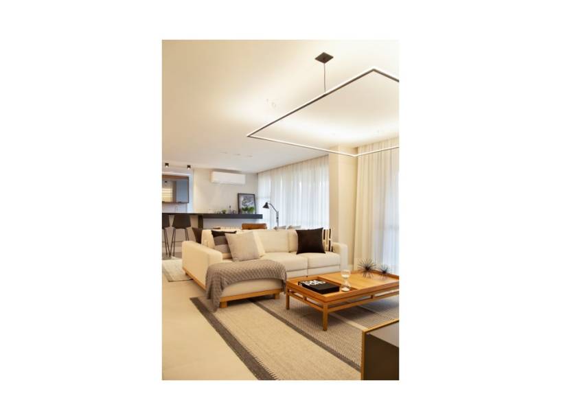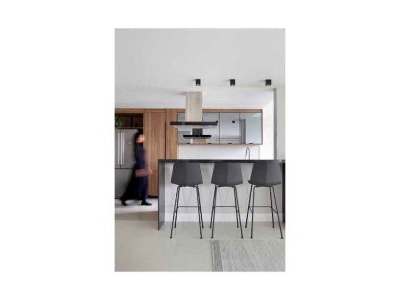 O bar em marcenaria ebanizada fixado na parede atrás da poltrona de leitura, que dá continuidade à bancada alta da cozinha em de granito preto; a mesa de jantar com oito lugares, que permite ao cliente reunir toda a família, confortavelmente; e a luminária de teto pendente, feita a partir de um perfil quadrado, que ajudou a setorizar visualmente a sala de tv.