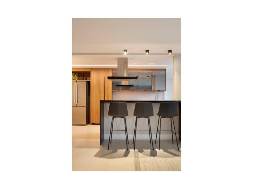 Já a cozinha integrada à sala tem materiais mais escuros e a marcenaria segue uma padronagem clássica, combinando preto, branco e freijó.