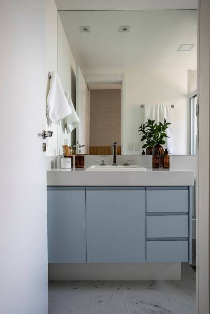 No banheiro, a arquiteta manteve os materiais entregues pela construtora, como piso, bancada de quartzo, metais, louças, espelho, iluminação, boxe e até nicho. Por aqui, a única modificação ficou por conta do gabinete. A marcenaria azul e cada detalhe de decoração deixaram o banheiro personalizado. “Usamos a laca azul e as portas e gavetas não contam com puxador aparente, mas cavas, que são bem práticas”, conclui a profissional.