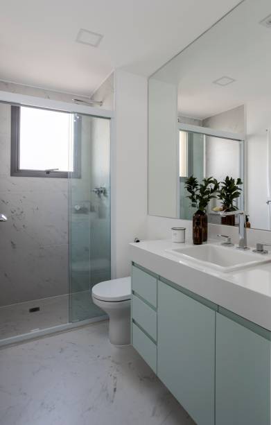 No banheiro de casal, os acabamentos como bancada, piso, box e espelho foram entregues pela construtora. Porém, faltava um toque de personalidade. Com isso, a marcenaria entrou em cena mais uma vez. Com uma laca verde-menta e puxador cava embutido, o gabinete não ocupa muito espaço e é bem prático.