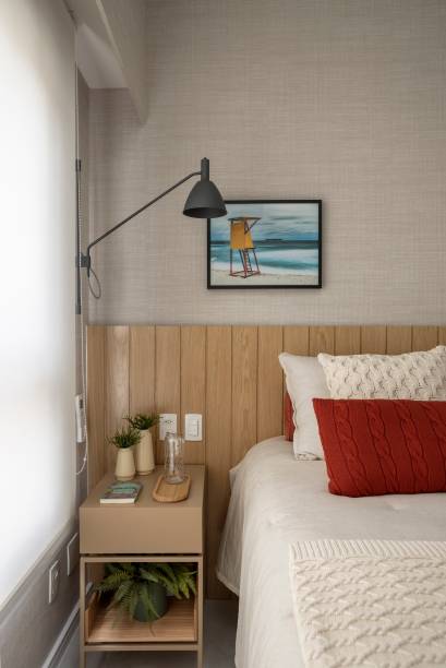 O segundo quarto, muito usado pelos hóspedes, recebeu cabeceira de madeira, cortina, iluminação e revestimentos em busca de acolhimento. Centralizada no ambiente, a bicama pode ser acionada quando há visitas, já os armários foram projetados para comportarem as malas com bastante espaço. Marina lembra que, por ser um dormitório para visitas, o cômodo precisava ter ainda mais conforto.