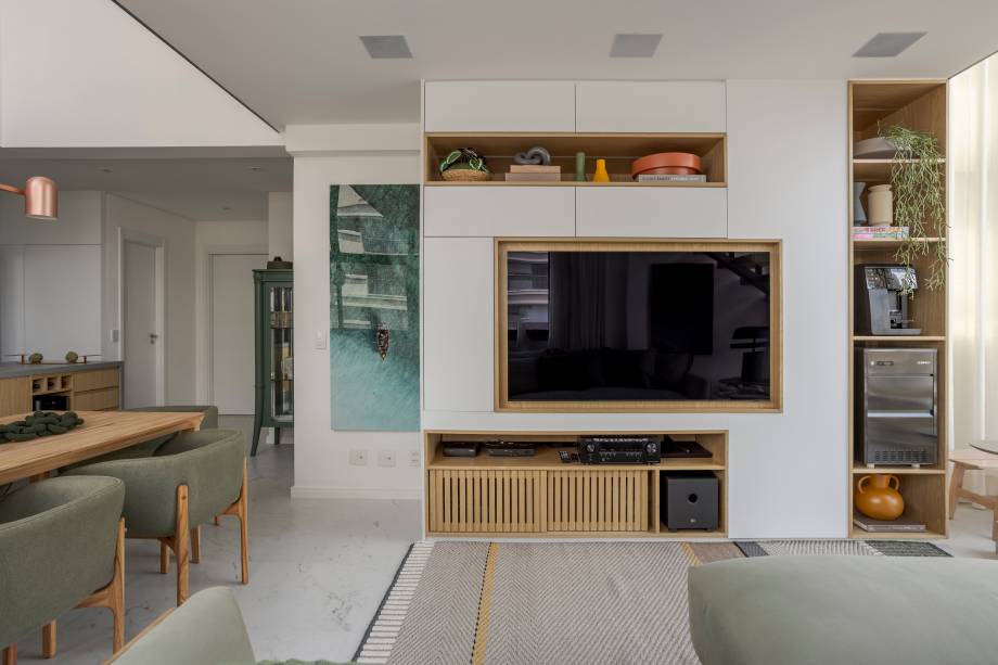 No estar, a arquiteta usou uma marcenaria bem planejada para compor o painel de TV de forma harmônica e elegante (ele esconde um pilar existente). Já a escada, leve e moderna, não cria nenhuma barreira visual no apartamento. Marina Carvalho optou por estrutura metálica, com pintura automotiva preta, que sustenta os degraus revestidos de réguas de bambu.