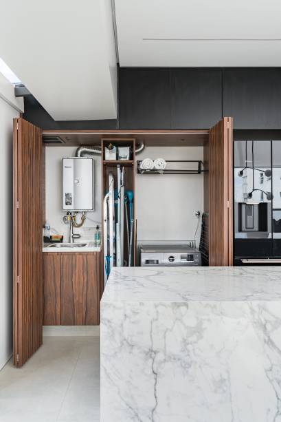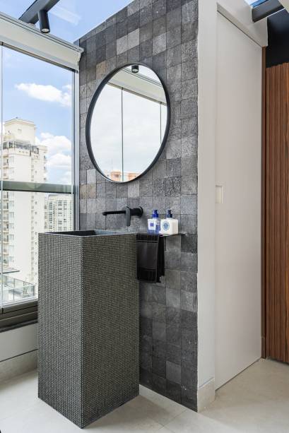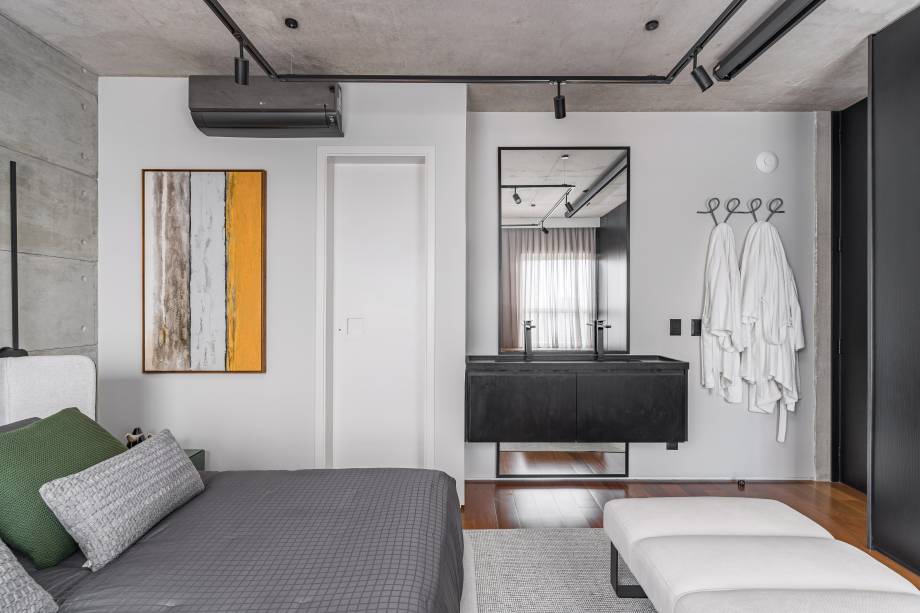 O painel preto com porta oculta separa o living da suíte. Aqui um pedido inusitado: a pia precisava ficar dentro do quarto, então a arquiteta colocou uma bancada com cuba esculpida em frente ao espelho.