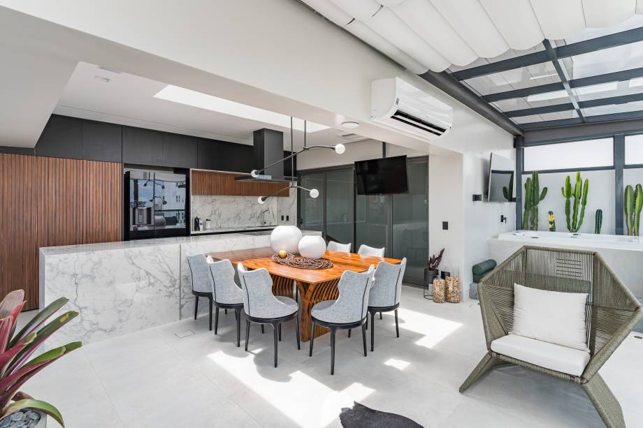 O segundo andar abriga o setor social: cozinha com ilha, lavanderia que pode ser escondida na marcenaria e uma sala de jantar que fica abaixo de uma claraboia.
