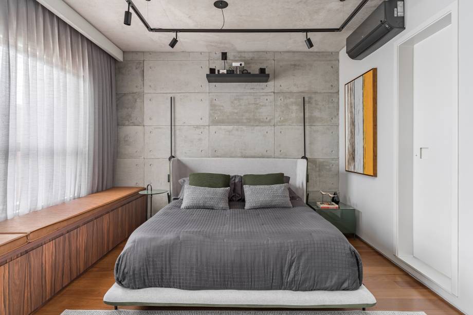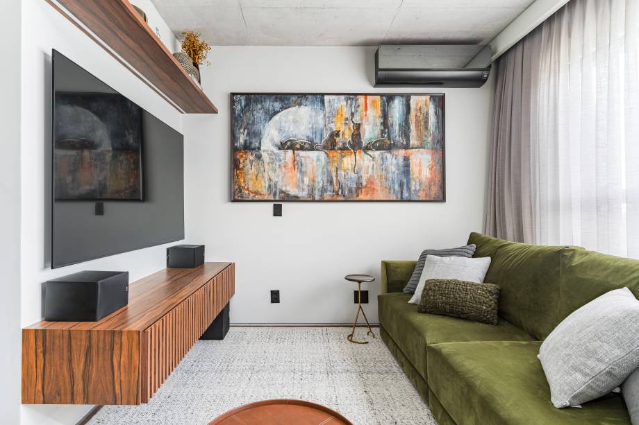 Na sala, a laje aparente não diminui o pé-direito e cria um clima industrial, junto com os trilhos de iluminação suspensos por cabos de aço. O rack com porta ripada esconde os eletrônicos, sem impedir a passagem do infravermelho do controle remoto.