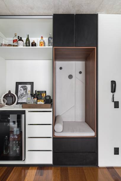 A entrada do imóvel é marcada por uma chapelaria com assento de futon sobre gavetas que servem de sapateira. Ali do lado, uma pequena copa que pode ser escondida por portas camarão dá apoio a esse andar, já que a cozinha fica no pavimento superior. Um bar também ocupa o espaço embaixo da escada.