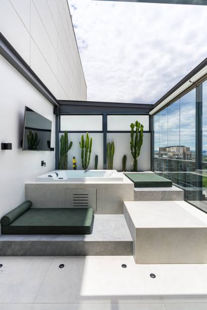 A parte reservada ao relaxamento reúne uma lareira móvel, um sofá em L e uma jacuzzi com patamares de acesso com futons. O jardim de cactos dá charme para o ambiente e toda essa área conta com fechamento de vidro retrátil e persianas.