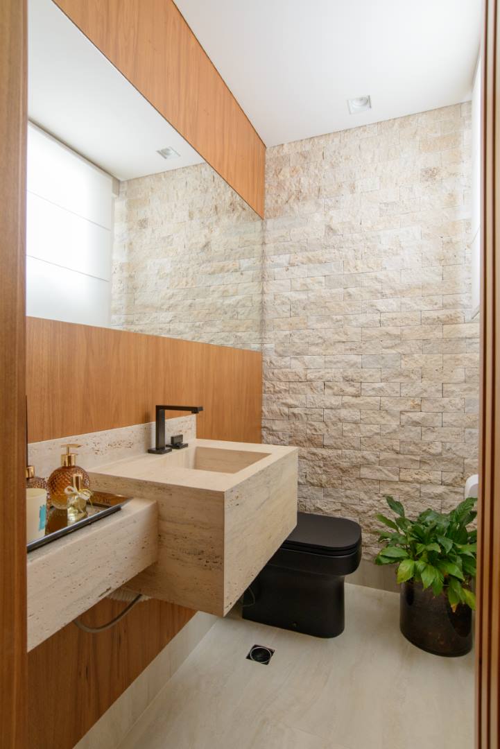 No lavabo, madeira, mármore e plantas criam um estilo natural.