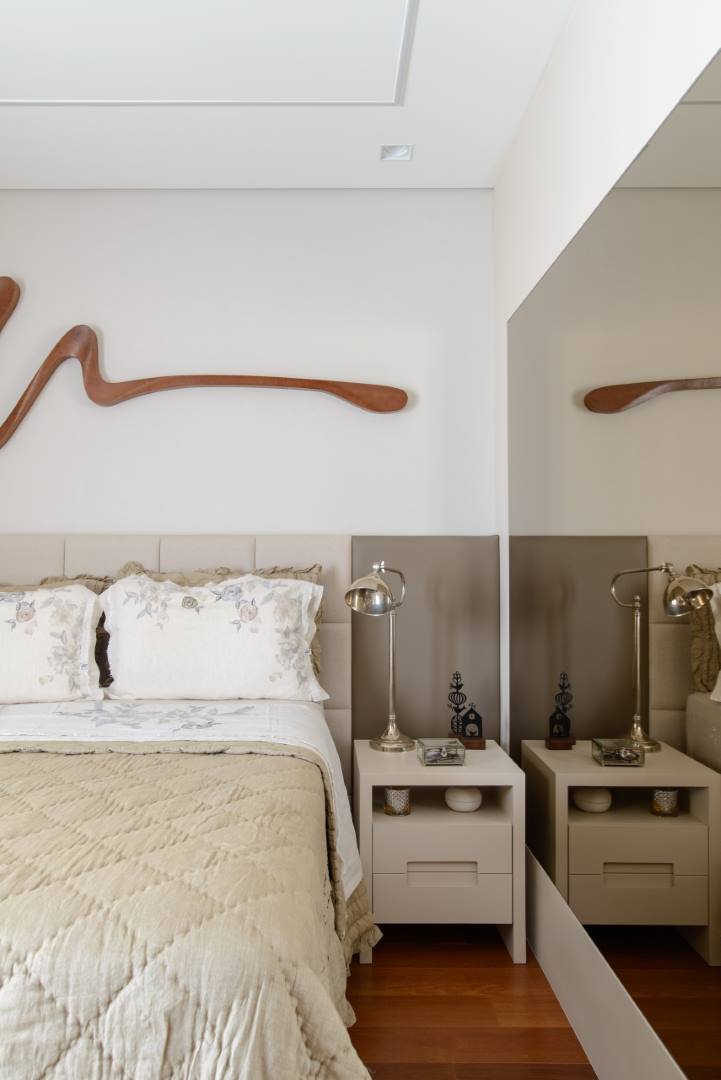 O apê escolhido – de 140 m² – tinha que ser confortável para a moradora e também para seus amigos, já que ela recebe muitas visitas e hóspedes. Um dos quartos virou closet e o banheiro foi reformado para separar as áreas de lavatório, penteadeira e área de banho.