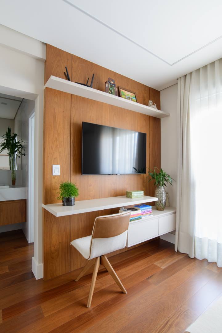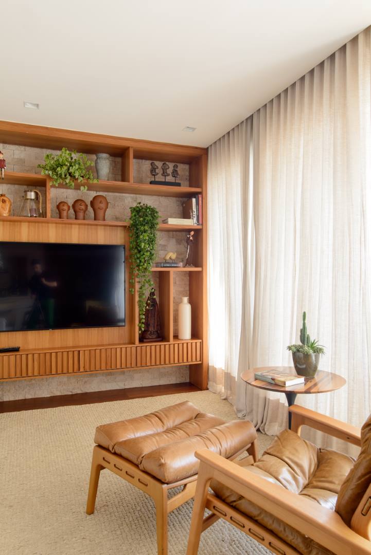 A estante da TV ganhou um fundo revestido de travertino anticatto e foi desenhada com detalhes para acomodar objetos pessoais e itens decorativos.