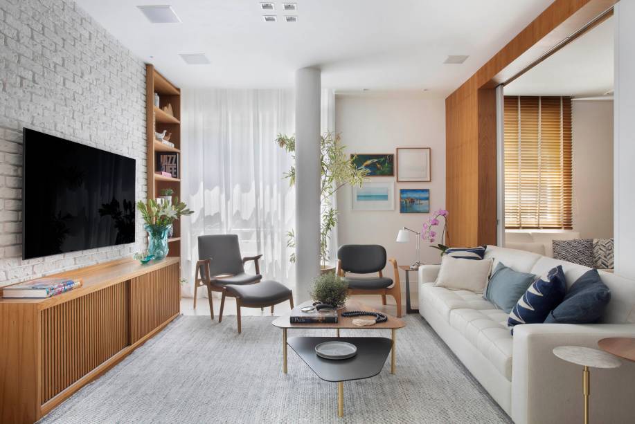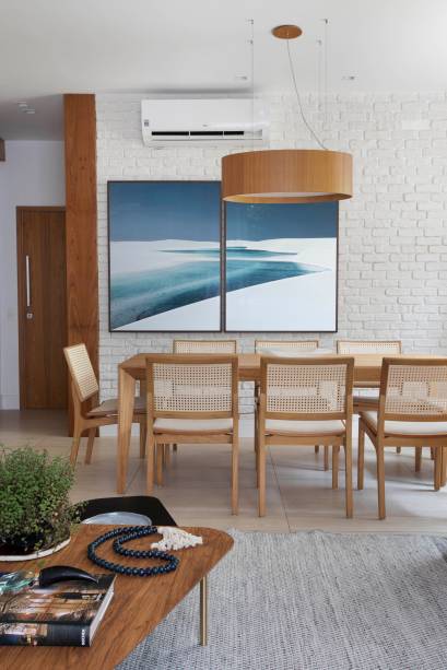 Para reforçar o clima de praia urbana, algumas paredes foram revestidas com tijolinho branco e o piso com porcelanato fosco na cor areia. A madeira natural, presente na marcenaria e em alguns móveis, transmite leveza e aconchego, sensação reforçada pelas texturas naturais das cortinas de linho branco e do tapete.