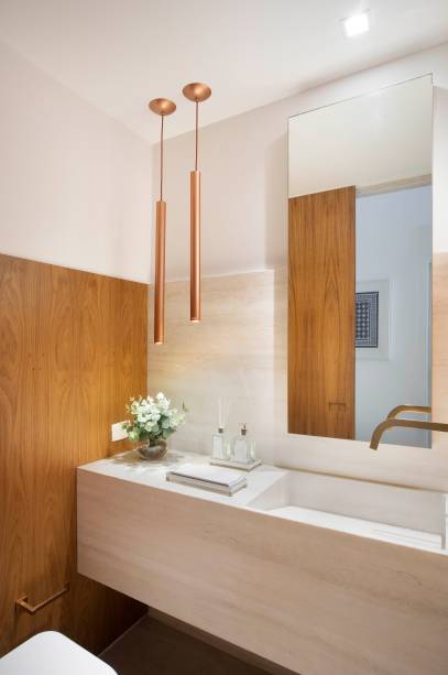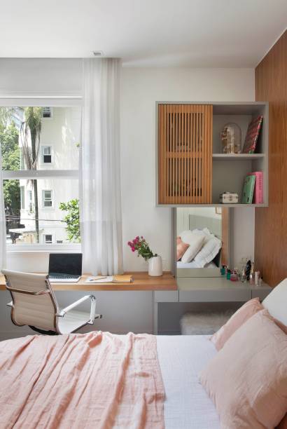 “Apenas pintei o pilar de branco e distribuí a ambientação em torno dele”, conta. Já na suíte do casal e da filha, o destaque fica por conta da marcenaria, que foi desenhada pela própria arquiteta e executada pela Canto de Dormir.