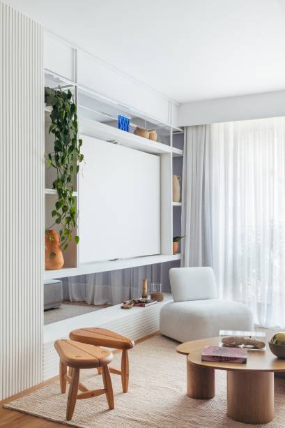 Apê de 160 m² em tons pastel alegres tem painel giratório de TV