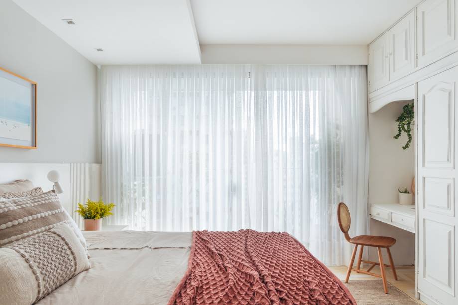 No quesito “materiais e acabamentos”, o piso foi revestido com réguas vinílicas no padrão amadeirado claro e as paredes pintadas com tinta na cor Cerração (da Suvinil). “As cortinas são de linho branco e as almofadas, além de coloridas, tem diferentes texturas para trazer aconchego”, ressalta a arquiteta. Como os armários existentes no escritório, na suíte do casal e no quarto da filha eram de boa qualidade, ela resolveu mantê-los, mudando apenas as cores e tirando o tom da madeira envelhecida.