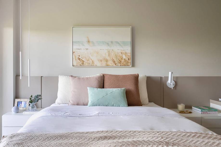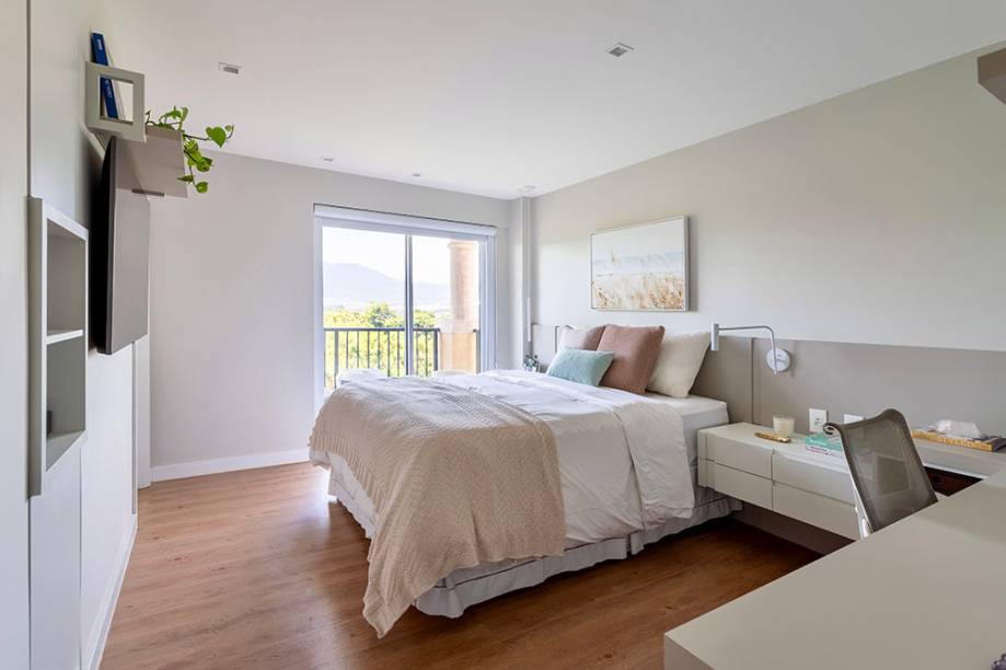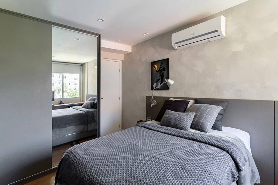 O quarto do casal também recebeu uma bancada, para ser utilizada com home office. Para a decoração, os moradores apresentaram à arquiteta referências em tons de cinza e madeira, além de projetos bem modernos.