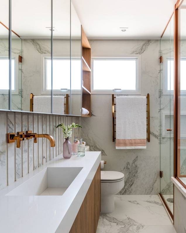 No banho da Sra., branco com veios cinzas, tom amadeirado e rose gold nos metais, já no banho do Sr., cimentícios, preto, cinza e tom amadeirado escuro com metal preto fosco. Na suíte das crianças a escolha foi por tom amadeirado mais claro, branco e cores primárias, com predominância do azul.
