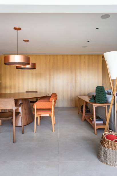 A marcenaria, tanto em sua cor tradicional como no tom vermelho queimado, oferece pontos coloridos pelo imóvel – a porta de entrada mimetizada é um grande destaque, pois intensifica a sensação de amplitude. Já o painel da sala de jantar é feito com madeira natural de carvalho americano.