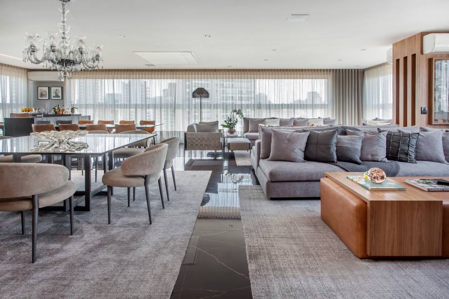 As delimitações dos espaços foram efetivadas por meio de tapetes, mesas, bancos e sofás, ressaltando a sutileza e o cuidado de Danielle e Paula para não misturar as áreas e garantir a privacidade, quando necessária. No piso, o porcelanato com aparência de pedra dá uma sensação de continuidade em todo o ambiente.