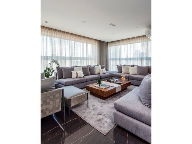 O espaço segue a proposta de tons da integração, mas conta com outras texturas nos tapetes e poltronas, além do amplo sofá que toma conta do ambiente. Próximo a varanda que foi totalmente envidraçada, a iluminação natural favorece o espaço e pode ser controlada pelas leves cortinas.