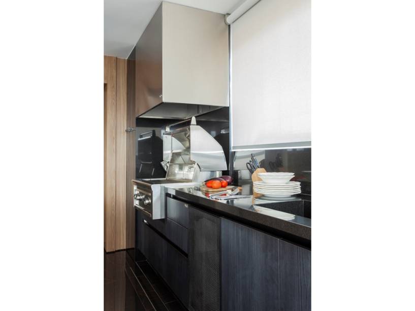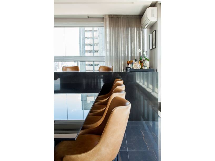 Mais que especial para os moradores, a área do bar foi executada totalmente sob medida para oferecer tudo que eles desejavam: frigobar, cervejeira e uma cave de vinhos, todos do mesmo tamanho para manter o alinhamento da bancada de granito preto absoluto.
