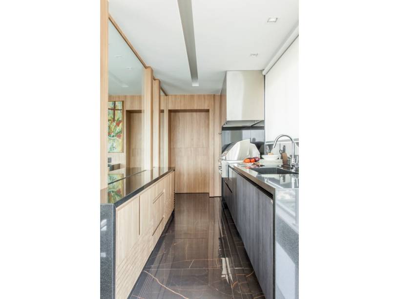 “É sempre muito gratificante entregar um novo lar. Como os moradores adoram receber, trabalhamos essa conexão para otimizar os espaços e sem exagerar nas cores e materiais. Por isso, a forte presença de nuances de cinza, preto e madeira são evidentes por todo o apartamento”, dizem as arquitetas.