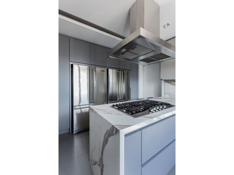 No caso da cozinha, o estilo atual, com toque de elegância, predomina no ambiente. A reforma trouxe novos revestimentos refletidos no piso de porcelanato cinza, sem qualquer textura, de acabamento natural para se misturar com uma bancada trabalhada de pedra techlam, estilo Kalos Bianco da Levantina – ultra resistente para evitar riscos e manchas.