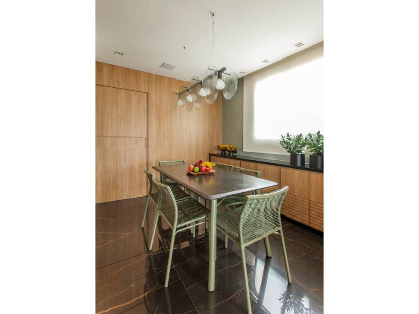 A cozinha é integrada com a sala de almoço, mas são locais mais intimistas da casa separados por um painel de correr das demais áreas. O grande destaque da sala de almoço é a peça desenhada sobre a mesa e os móveis com estrutura de alumínio corda náutica com cores esverdeadas.