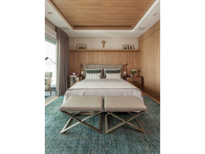 O quarto do casal é delicado e uma luminosidade agradável. Os tons amadeirados e claros adicionam uma atmosfera ainda mais aconchegante e o tapete azul, além da cor, propicia conforto. O leve contraste das cores se torna visualmente confortável e na medida certa para o casal relaxar com noites tranquilas.