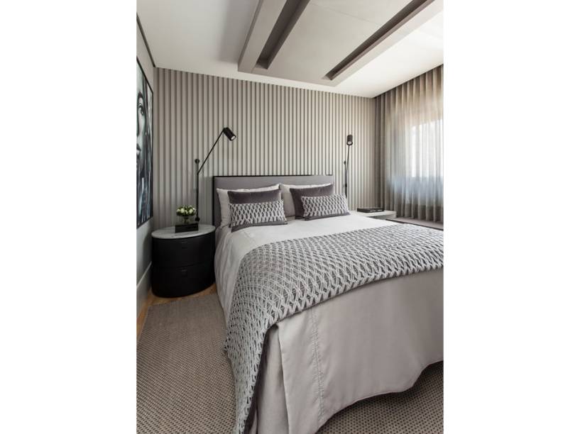 No quarto do filho do casal, as arquitetas aplicaram a mistura da madeira com preto para tornar o ambiente mais forte. No quarto da filha, a ideia foi executar um layout mais centralizado e pautado em tons mais claros de cinza e branco.