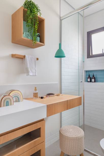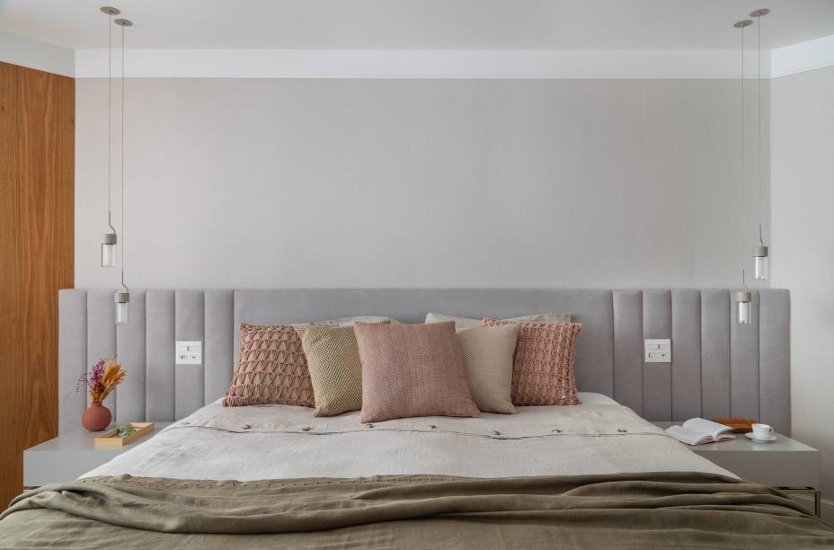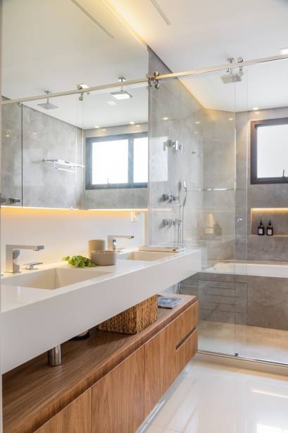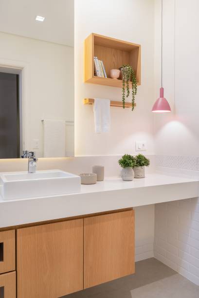 Ela também recebe luz natural da sala de vestir-escritório da moradora, através de aberturas com vidro translúcido, um elemento sempre presente no pensamento da profissional para os espaços.