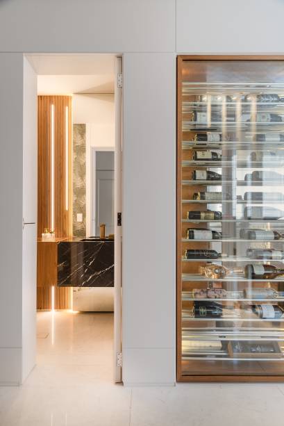 A adega também foi minuciosamente planejada em colaboração com o cliente e a Joshua Adegas, considerando a distribuição e o efeito final da disposição. Ela até inclui uma vitrine voltada para a galeria de entrada, destacada pelo painel de madeira laqueado que reveste a coluna, viga e paredes, criando uma harmonia com a porta do lavabo.