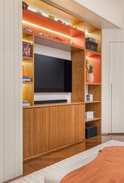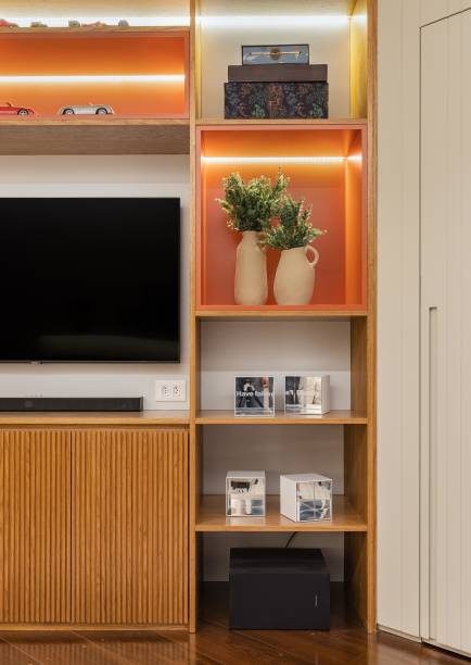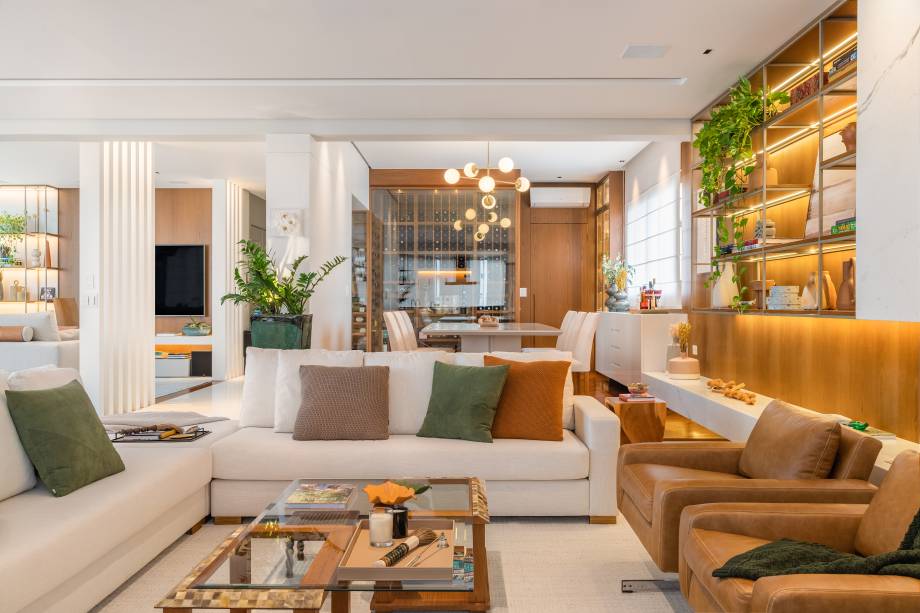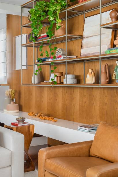 Um dos destaques é grande parede que se estende desde a área de estar até a sala de jantar, planejada de forma contínua e integrada. Elementos como a lareira, estantes sobre uma prancha de mármore, buffet e cristaleira foram cuidadosamente dispostos ao longo dessa parede, conectados pelo painel de madeira e pelo design contínuo dos volumes.