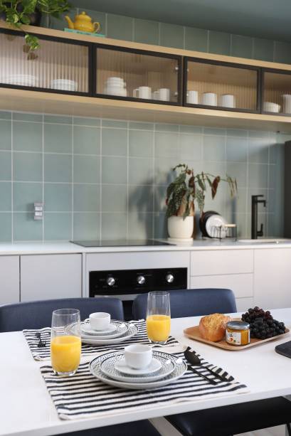Para delimitar a área da cozinha, foi criado um “colorblock” em tom de verde, instalando um revestimento de cerâmica hidráulica verde mar no piso e backsplash aplicado nas paredes laterais e teto com pintura em tom da mesma cor do revestimento proporcionando uma uniformidade.