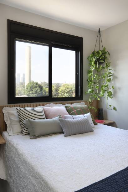 No quarto do casal há uma cama queen com box baú para ampliar os espaços de armazenamento, cabeceira ripada com LED embutido e mesas laterais com desenho leve para dar suporte à cabeceira.