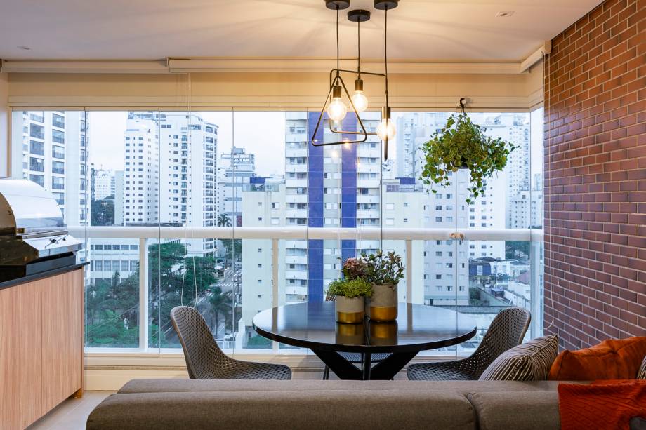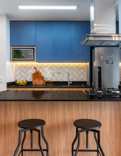 Estruturalmente, a profissional integrou a cozinha, a varanda e a sala do imóvel de 45 m². Também foi criada uma porta do banheiro para o estar, transformando-o em um banheiro social. A decoração possui estilo contemporâneo, muita madeira e paleta de cores azul e preta.
