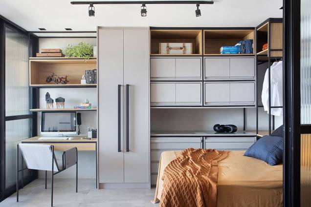 Foi este recurso que permitiu delimitar, por exemplo, o quarto de dormir com escritório, que agora pode ser totalmente isolado, quando necessário, sem comprometer a passagem de luz natural, que vem do janelão piso-teto na fachada do prédio.