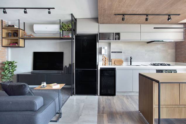 Já o porcelanato no padrão madeira e a parede de tijolinho entram para deixar os ambientes mais quentes e acolhedores. “Esta mix trouxe sofisticação e modernidade ao projeto”, avalia o engenheiro.