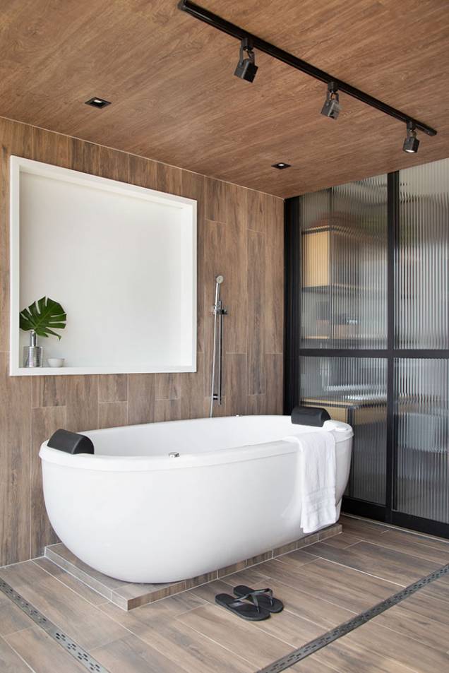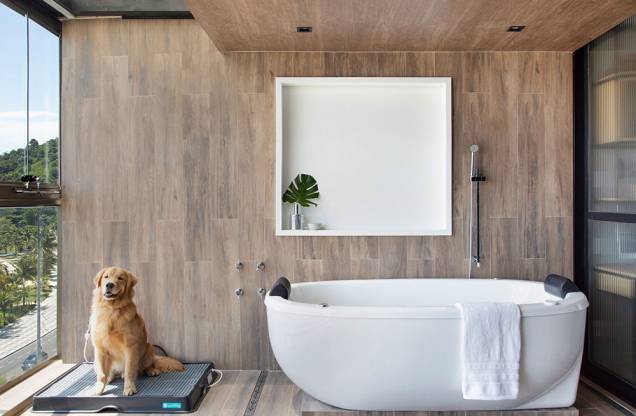 No projeto se destacam ainda a banheira de imersão fora do banheiro, posicionada ao lado da cozinha e de frente para o mar para que o morador possa contemplar a vista da praia enquanto relaxa; e o uso do mesmo porcelanato no padrão madeira no piso, paredes e teto na área próxima à janela, que não só delimita o ambiente da cozinha como também cria uma espécie de moldura da vista do mar.