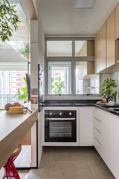 A cozinha foi parcialmente isolada por uma parede e delimitada por um móvel de marcenaria que funciona como rack na sala de estar e se prolonga como bancada de refeições.