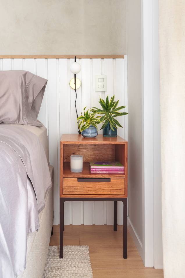 “No quarto, projetamos a cabeceira com as ripas largas e o detalhe em MDF madeirado, que valoriza a parede com a textura de cimento queimado, deixando o ambiente mais descontraído” finaliza a profissional. Toda a marcenaria do apartamento foi desenhada com exclusividade pelo escritório para atender as necessidades dos clientes.