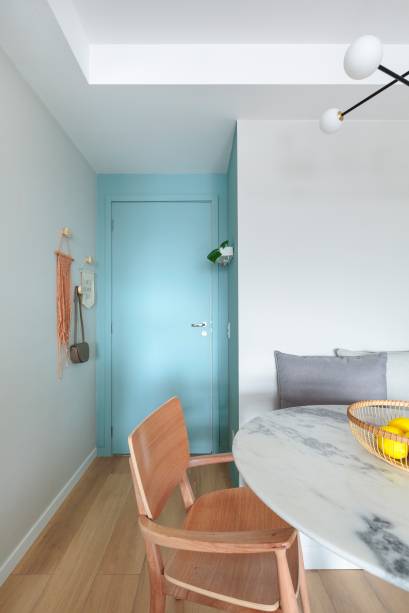 Já para a sala de jantar, a arquiteta valorizou o espaço com as duas cadeiras de madeira com braços mais confortáveis e o pendente, que é o ponto de atenção desse cantinho que é valorizado ainda mais pelo tom de azul que pintamos para demarcar a porta e hall de entrada do apartamento.