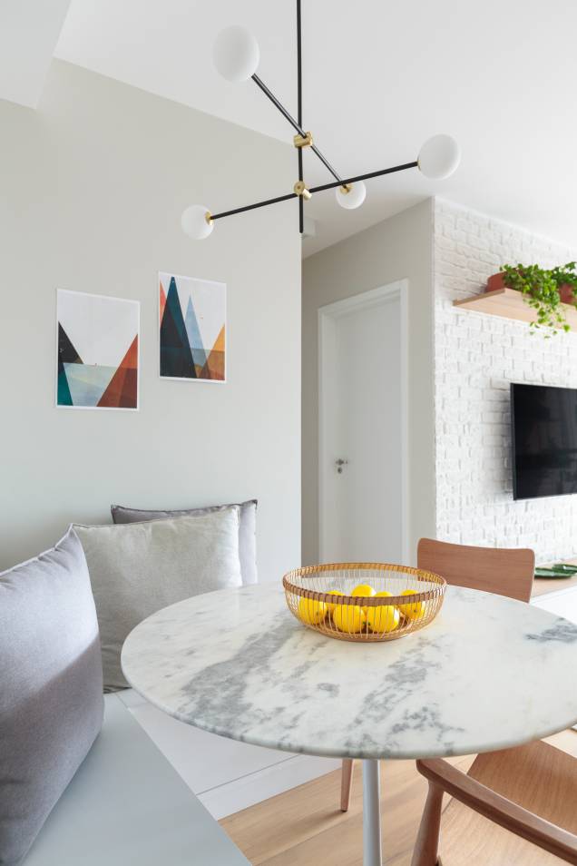 A mesa de jantar com o canto alemão permitiu a conjugação do ambiente com a sala de estar e a cozinha e deixou o espaço mais bem aproveitado. “Trabalhamos bastante as cores, texturas e formas desse projeto, sempre pensando nos ambientes como um só”, comenta a arquiteta.