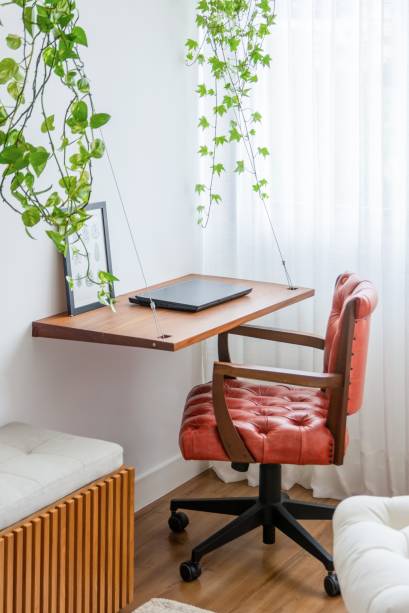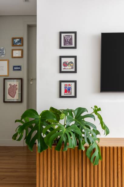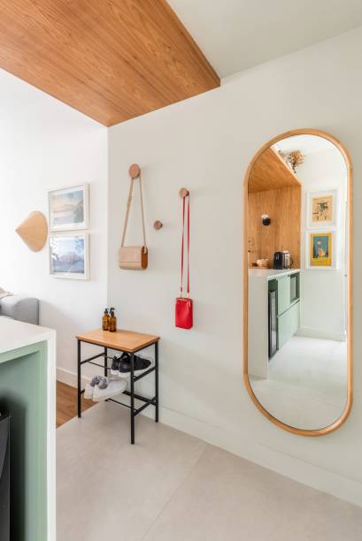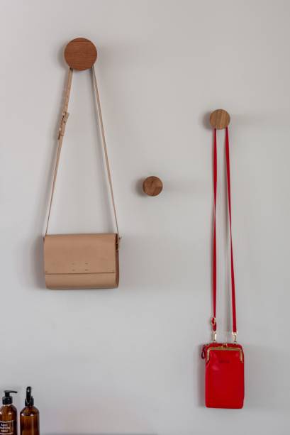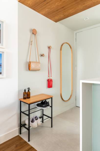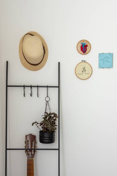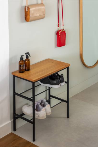 O hall de entrada ganhou um revestimento cerâmico, porta branca e uma chapelaria. O ambiente ainda conta com ganchos estrategicamente posicionados e um espelho oval.