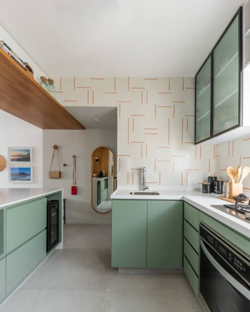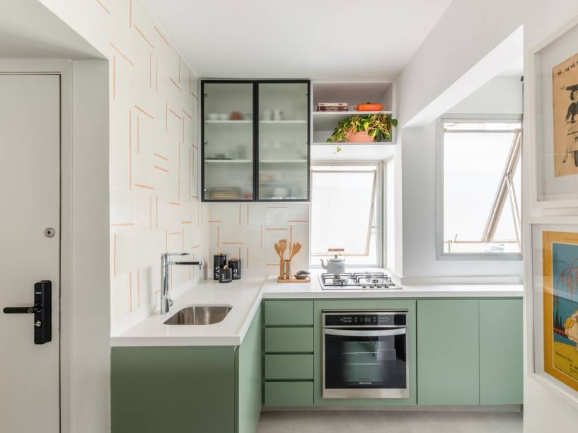 Apê charmoso de 60 m² tem hall com chapelaria e cozinha clara com ladrilhos