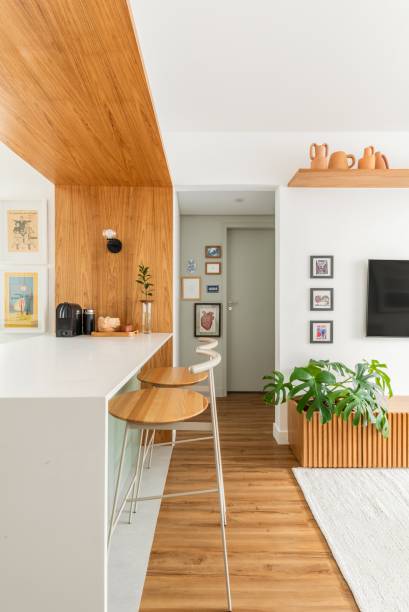 A cozinha e a sala de estar agora coexistem em um conceito aberto, facilitando a interação e o entretenimento, sem sacrificar a privacidade das áreas íntimas. O revestimento do piso dialoga com o painel de marcenaria, assim como à bancada de quartzo branco, ambos elementos que conferem uma estética limpa e contemporânea.