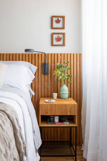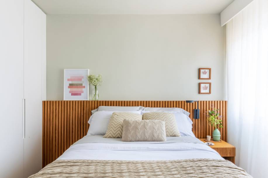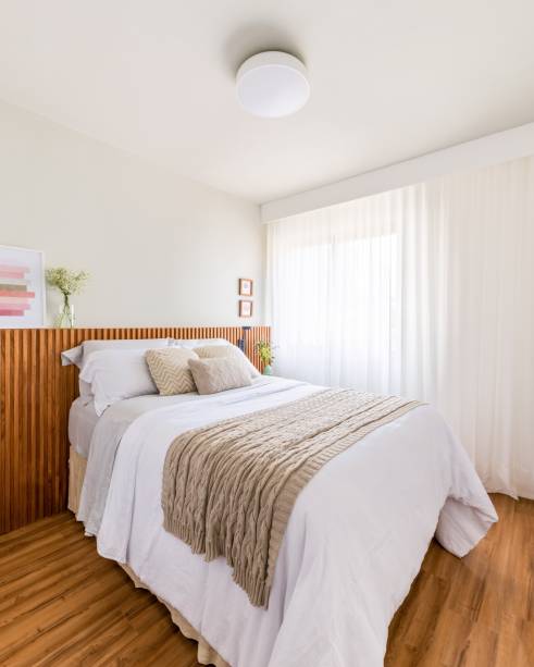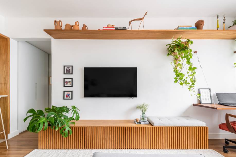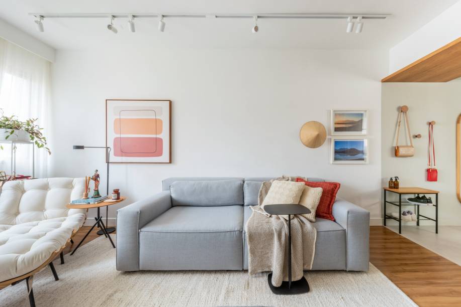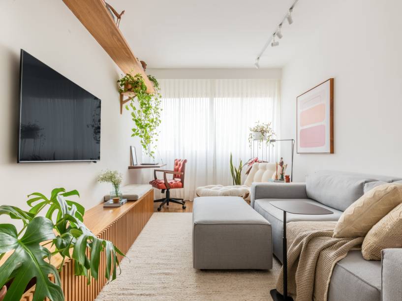 O conforto vem do mobiliário, composto por um sofá acompanhado de um pufe, uma mesa lateral funcional, almofadas, mantas e um tapete que adicionam textura e calor ao ambiente.